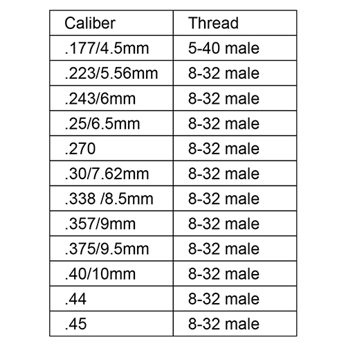 0,177, 0,22, 6 mm, 0,25, 0,27, 0,30, 0,338, 0,35, 0,357, 0,40, 0,44, 0,45, 0,50cal.