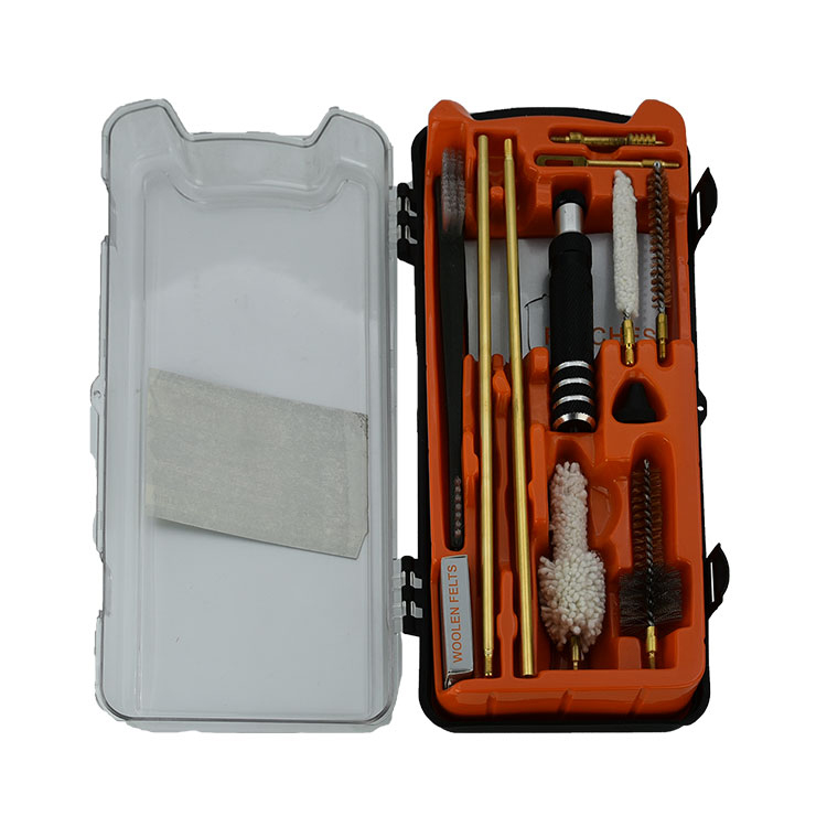 Kompakt tabanca temizleme kitleri, farklı tabanca kalibrelerine uygun tam profesyonel temizleme araçları sağlar. Blister tepsiler bunları düzenli olarak toplamanıza yardımcı olur. Küçük hacmi ve sağlam kasası, bunları silah kutularına veya çuvallara koymanıza olanak tanır. Seride yağ şişesi yoktur.