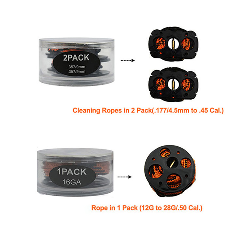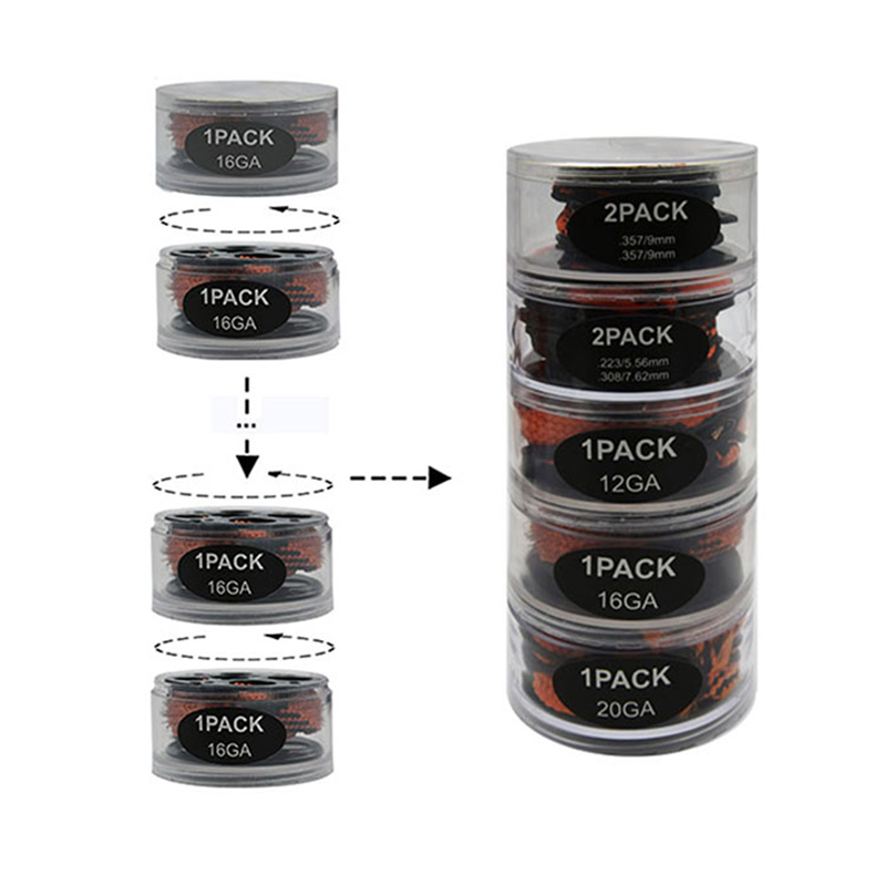 ● Bu çok katmanlı silindir, çeşitli kalibrelerde çok sayıda yılan tabancası temizleme ipinden oluşur. Depolama ve toplama için uygundur. İç çekirdek sadece halat sarma çekirdeği olarak değil aynı zamanda çekme kolu olarak da kullanılabilir. Böyle silindirik bir paketi bulmak, tek bir paketi bulmaktan daha kolaydır. Tasarım Rotchi'ye ait patentlidir.