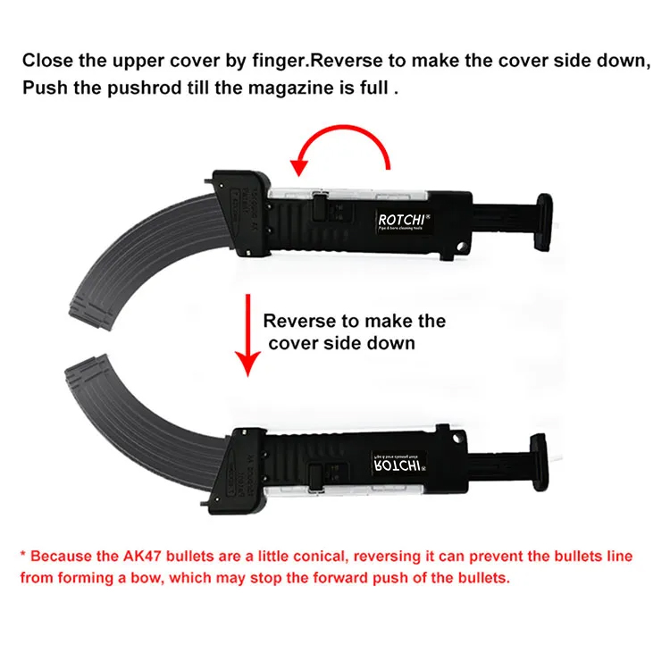 AK47 için Şarjör Hızlı Yükleyici ● 10/20/30 veya daha büyük kapasiteli AK şarjörüne 7.62X39mm fişekleri yüklemek için kullanılır. ● Fişekleri yuvaya kadar doldurun, şarjörü AK mekanik prensibine göre takın. iticiyi itin, fişekler şarjöre kolayca girecektir. ● Kullanımı kolaydır, bir kız çok hızlı bir şekilde yapabilir. ● Güçlü gövde. Şeffaf kapaktan yükleyicinin içindeki fişekleri görebilirsiniz. Bir kilit, kapağın depolama sırasında açılmamasını kontrol eder. ● Atış yapmadığınız halde şarjör dolu olduğunda da fişekleri şarjörden boşaltabilir.