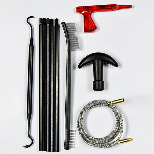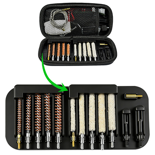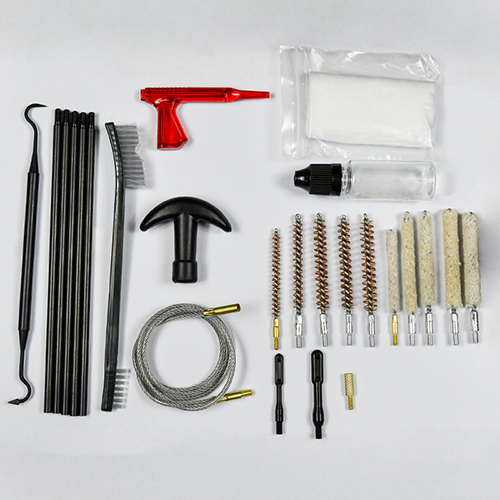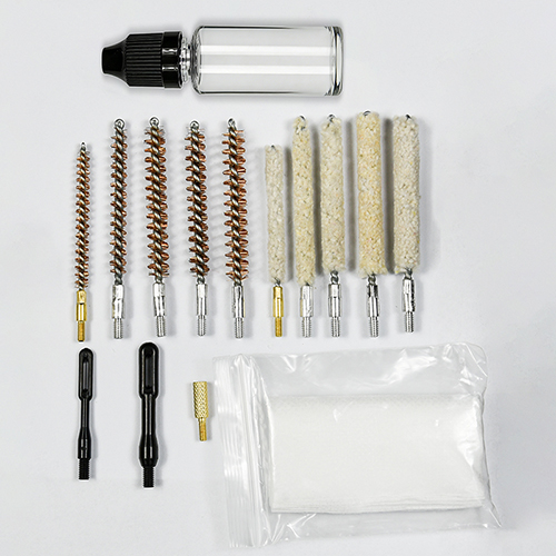 Tüfek temizleme seti 5 boyutta (.177, .22, .243, .27, .30 cal.), pirinç fırçalar içerir ve pamuklu paspaslar, 5 çubuk, 2 calbe. Seçimler için kumlar ve siyah renk.